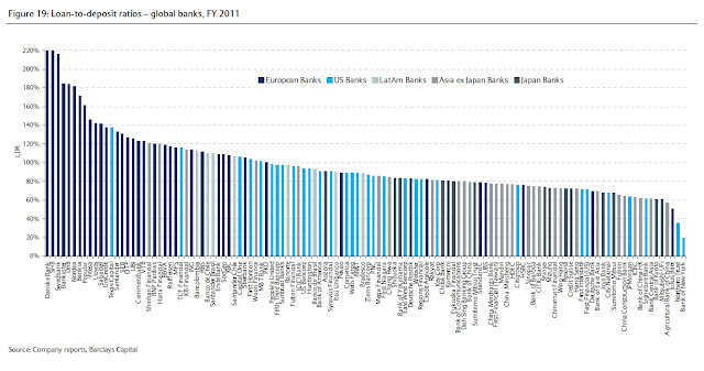 Non ci sono valori "magici" di questo indicatore, che normalmente varia tra il 50 e il 120%. Il grafico in basso (click per ingrandire) mostra che per un certo numero di grandi banche europee (ed italiane), alla fine del 2011 la situazione era al limite del collasso, ossia dell'illiquidità.